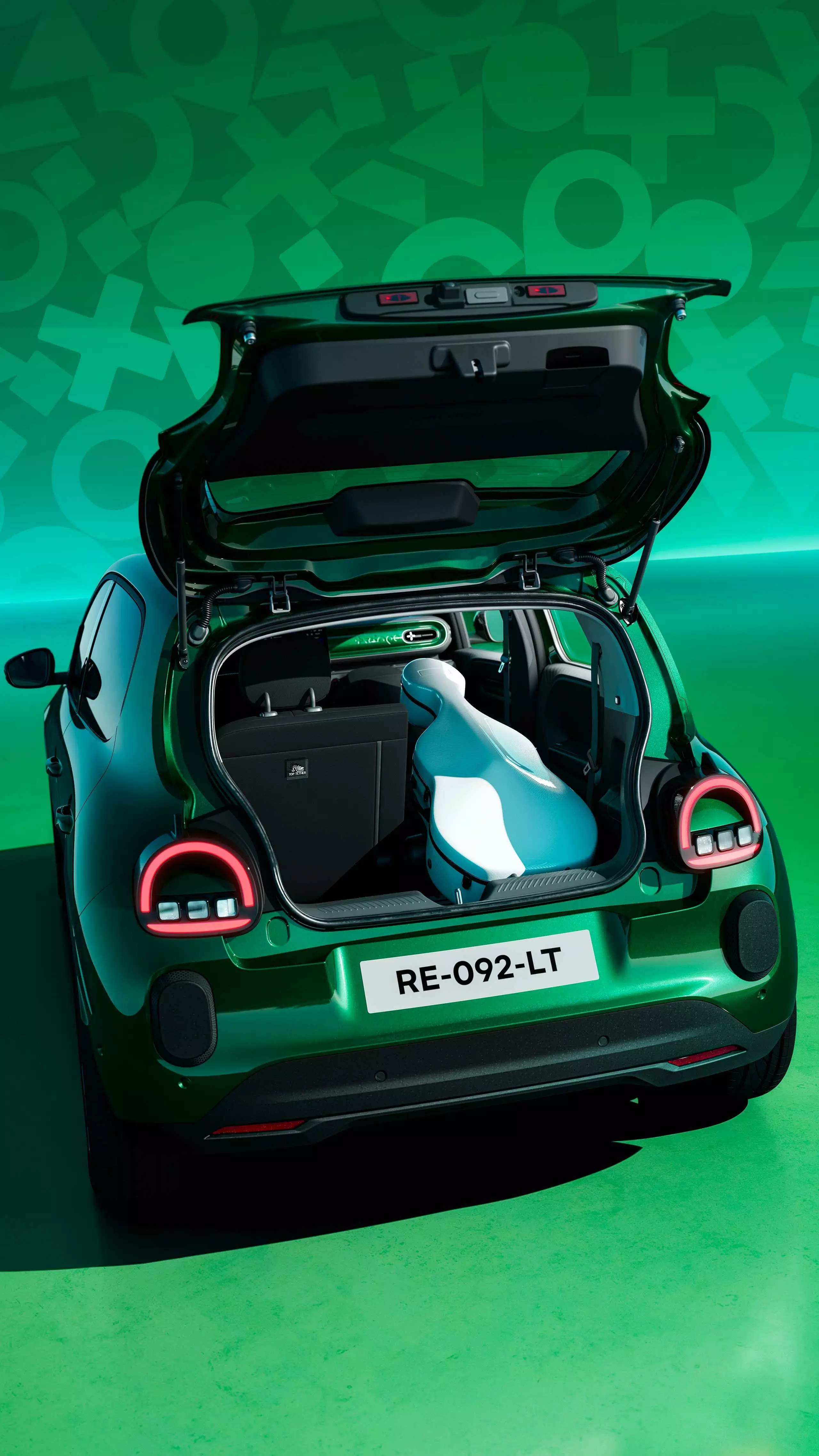 Pequeño por fuera pero amplio por dentro, el Twingo E-Tech eléctrico ofrece hasta 360 litros de volumen de maletero y un espacio para las rodillas de hasta 16 cm en la parte trasera. Su modularidad permite aprovechar al máximo el interior: los asientos traseros son independientes, deslizantes y abatibles 50/50, mientras que el asiento del acompañante se puede plegar para ampliar la longitud de carga.